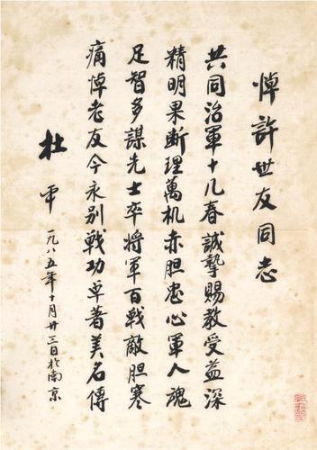 在采訪一位又一位身經(jīng)百戰(zhàn)的幸存者時,吳東峰與他們的筆墨緣也就此結(jié)下?!?985年許世友將軍因病逝世,杜平將軍親手書寫‘悼許世友同志’詩一首,請我送《人民日報》刊登,我把詩傳真過去,原件保存下來了。這首詩見證了杜平與許世友的深厚友情,是我最早的將軍墨跡手藏。那之后,我開始有意識地收集將軍們的筆墨?!?/p>