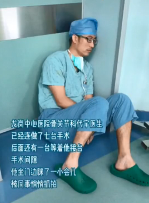 他連做7臺手術,在第8臺手術開始前的間隙,靠著墻睡著了