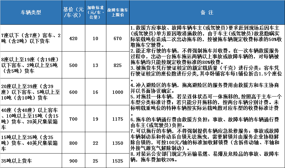 廣東省高速公路拖車服務(wù)收費標(biāo)準(zhǔn)見下表: