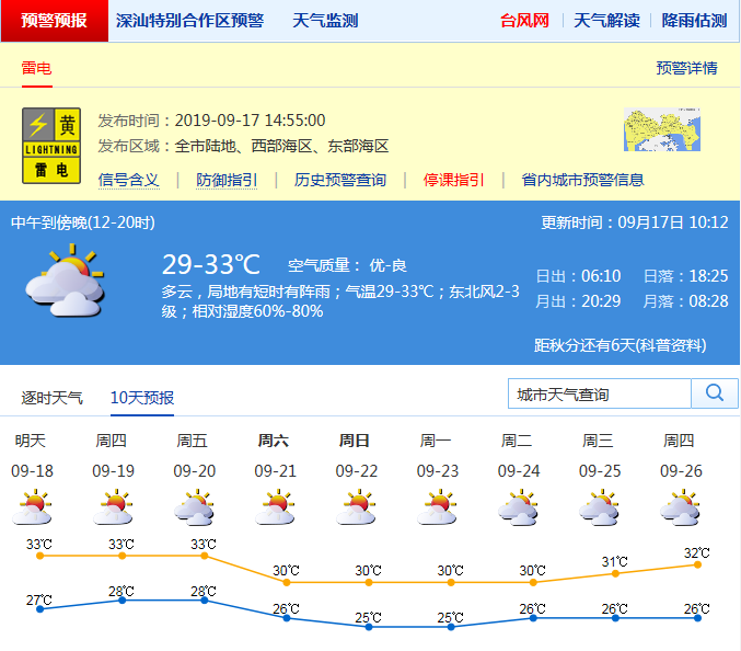 深圳市氣象臺于9月17日14時55分在全市發(fā)布雷電預警,預計60分鐘內(nèi)全市將受雷電影響,按照防御預案停止戶外易燃易爆危險作業(yè),并加強?;瘓鏊踩芾怼?/p>