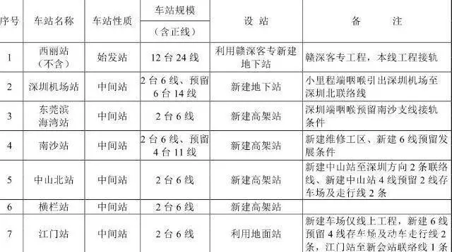 新建深茂鐵路深圳至江門段為高速鐵路,雙線。正線西麗至南沙段及深圳北至深圳機場聯(lián)絡(luò)線時速200公里,正線南沙至江門段時速250公里;新建設(shè)西麗、深圳機場、濱海灣、南沙、中山北、橫欄、江門共7座車站。