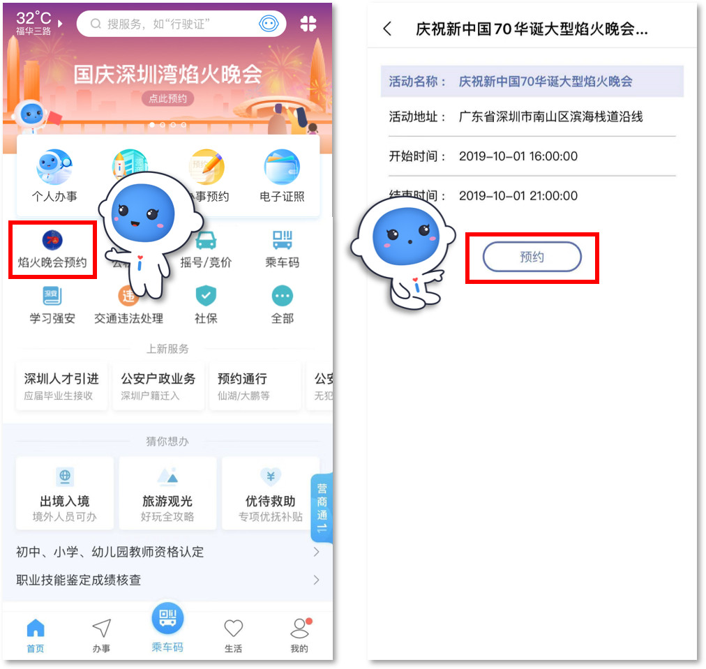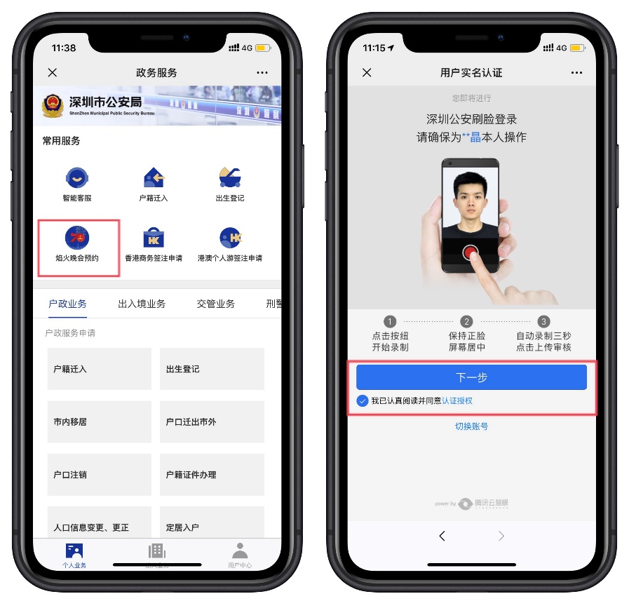 1.關(guān)注“深圳公安”微信公眾號(hào),選擇“民生”欄,點(diǎn)擊焰火晚會(huì)預(yù)約,通過(guò)人臉認(rèn)證后即可進(jìn)入預(yù)約頁(yè)面,如下圖所示: