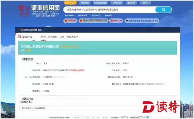 用戶登錄“深圳信用網(wǎng)”,只需根據(jù)頁面指示搜索相關(guān)鍵字,查詢頁面即可查到房地產(chǎn)中介機(jī)構(gòu)的注冊備案地址、注冊時間、星級評價以及誠信記錄等信息。
