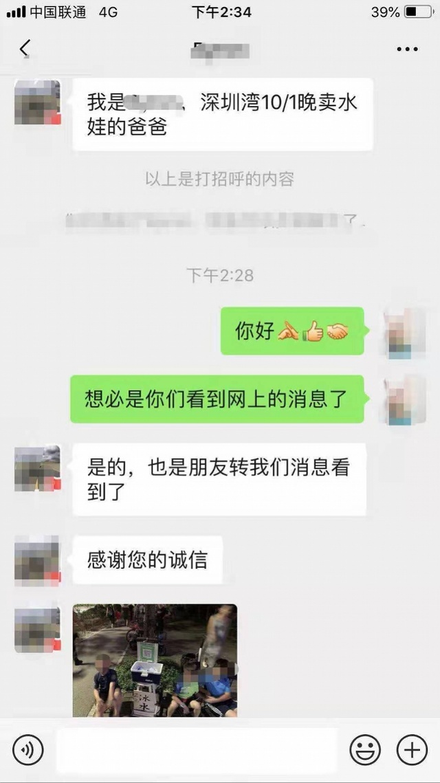 4日,剛從深圳返回青島的張先生告訴記者,中午2時(shí)35分,他的微信出現(xiàn)一個(gè)新增好友,對(duì)方說自己是深圳灣10月1日晚賣水男孩的爸爸,張先生立刻把對(duì)方加為好友。賣水男孩爸爸通過微信給張先生發(fā)來一張照片,是國慶當(dāng)晚孩子在路邊賣水時(shí)拍的,讓張先生確認(rèn)一下是不是照片上的孩子?!笆撬麄?,太好了,終于找到了?!睆埾壬S即通過微信轉(zhuǎn)賬10元錢過去,賣水男孩爸爸也收款成功。(此前報(bào)道:緊急尋人!深圳灣畔的賣水孩子,青島大叔在找你…)