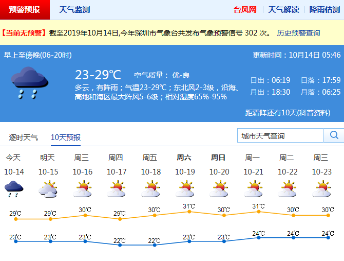 見圳客戶端·深圳新聞網(wǎng)2019年10月14日訊 受冷空氣影響,昨日凌晨至上午深圳普降大雨,局部暴雨,并伴有雷暴和7級左右短時大風(fēng)。預(yù)計本周前期風(fēng)力清勁有陣雨,中后期晴好干燥。其中,周一有陣雨,高地、沿海和海區(qū)陣風(fēng)6-7級,早晚較涼,氣溫23-29℃;周二漸轉(zhuǎn)多云,陣風(fēng)7-8級;周三至周日晴天干燥。