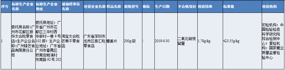 其中,深圳市龍崗區(qū)泰匯吃零食店經(jīng)營(yíng)的淘寶店銷(xiāo)售的糖姜片,被檢出二氧化硫殘留量不符合食品安全國(guó)家標(biāo)準(zhǔn)規(guī)定,存在食品添加劑超限量使用的問(wèn)題。