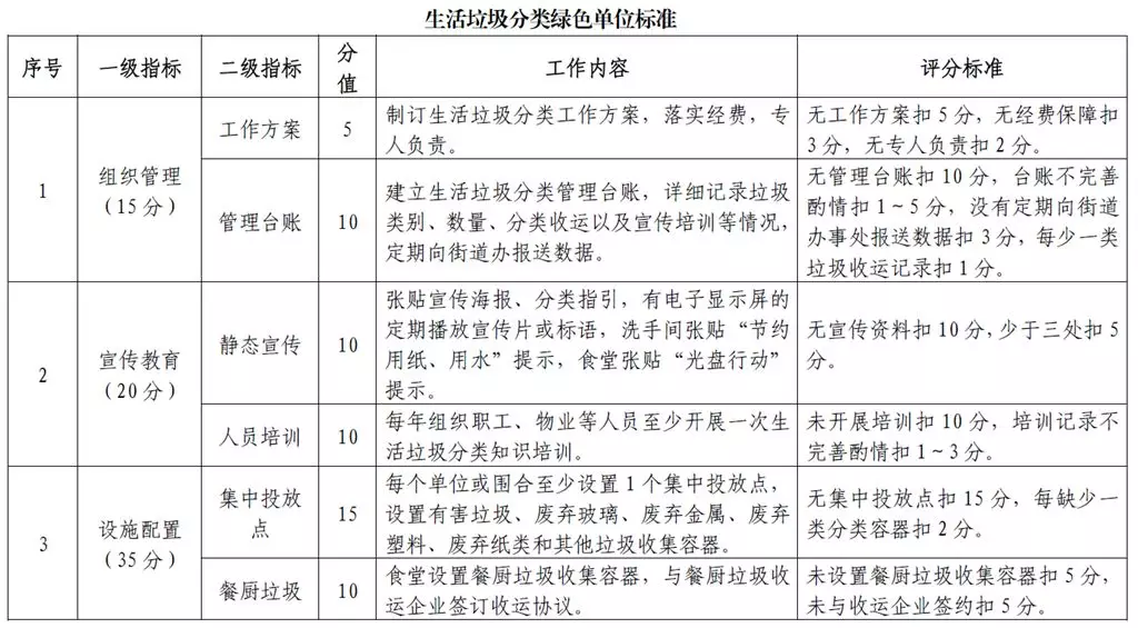 針對單位激勵對象不同,《辦法》還詳細(xì)制定了《生活垃圾分類綠色單位標(biāo)準(zhǔn)》《生活垃圾分類綠色學(xué)校標(biāo)準(zhǔn)》《生活垃圾分類綠色小區(qū)標(biāo)準(zhǔn)》等要求;針對個(gè)人激勵對象,也明確提出了垃圾分類督導(dǎo)員、志愿者、教師和其他從業(yè)人員等不同要求。