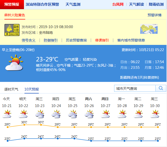見(jiàn)圳客戶端·深圳新聞網(wǎng)2019年10月21日訊 深圳未來(lái)一周天氣較為穩(wěn)定,天氣持續(xù)干燥,預(yù)計(jì)21日晴天間多云,早晚能見(jiàn)度較差,有輕霧;氣溫23-29℃;東風(fēng)2-3級(jí);相對(duì)濕度45%-90%。22日晴天間多云,早晚有輕霧;23-24日多云,偶有零星小雨,早晚有輕霧;25-27日晴天干燥。