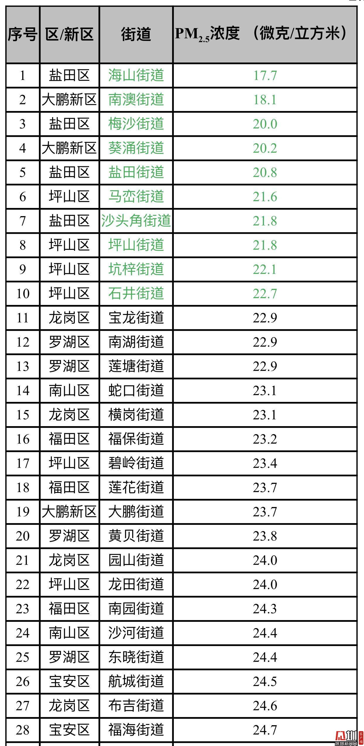 見圳客戶端·深圳新聞網2019年10月22日訊(見圳客戶端、深圳新聞網記者 陳婕)10月22日,記者從深圳市生態(tài)環(huán)境局了解到,2019年9月,全市74個街道PM2.5濃度在17.7-37.4微克/立方米之間,均值為26.1微克/立方米。排名前十的是海山、南澳、梅沙、葵涌、鹽田、馬巒、沙頭角、坪山、坑梓和石井等街道,排名倒數前十的為新湖、桃源、西鄉(xiāng)、福永、公明、大浪、馬田、觀瀾、福城和新安等街道。