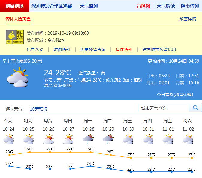北方因為降溫,人們早已套上毛衣、穿起秋褲,深圳的小伙伴還在穿著夏裝。昨天白天,全市晴天間多云,早晚較清涼,最低氣溫21℃-23℃,最高氣溫29℃-30℃。全市森林火險黃色預警信號生效中。
