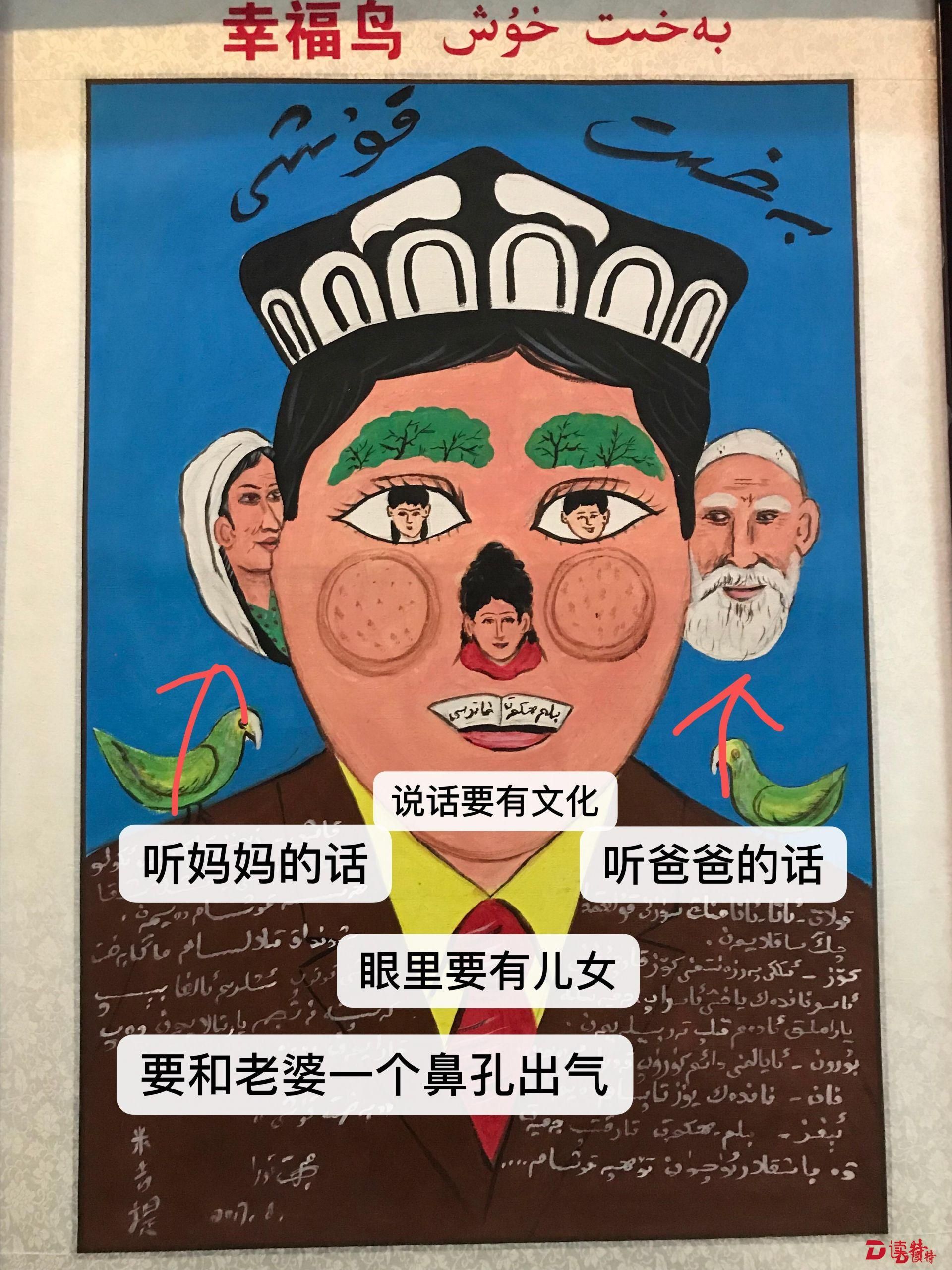 牧民的帳篷、肥壯的牛羊、路旁的榆錢(qián)樹(shù)……在刀郎農(nóng)名畫(huà)展廳里記者看到,平日生活中隨處可見(jiàn)的事物一一被刀郎人在勞動(dòng)和生活中用敏銳的目光捕捉,并將其躍然紙上,幽默中透視矛盾,夸張中充滿情緒宣泄,一幅幅作品活靈活現(xiàn)、色彩斑斕,讓人眼花繚亂,構(gòu)成了“刀郎農(nóng)民畫(huà)”畫(huà)家在處理反映現(xiàn)實(shí)主義和浪漫主義別具一格的藝術(shù)特色。