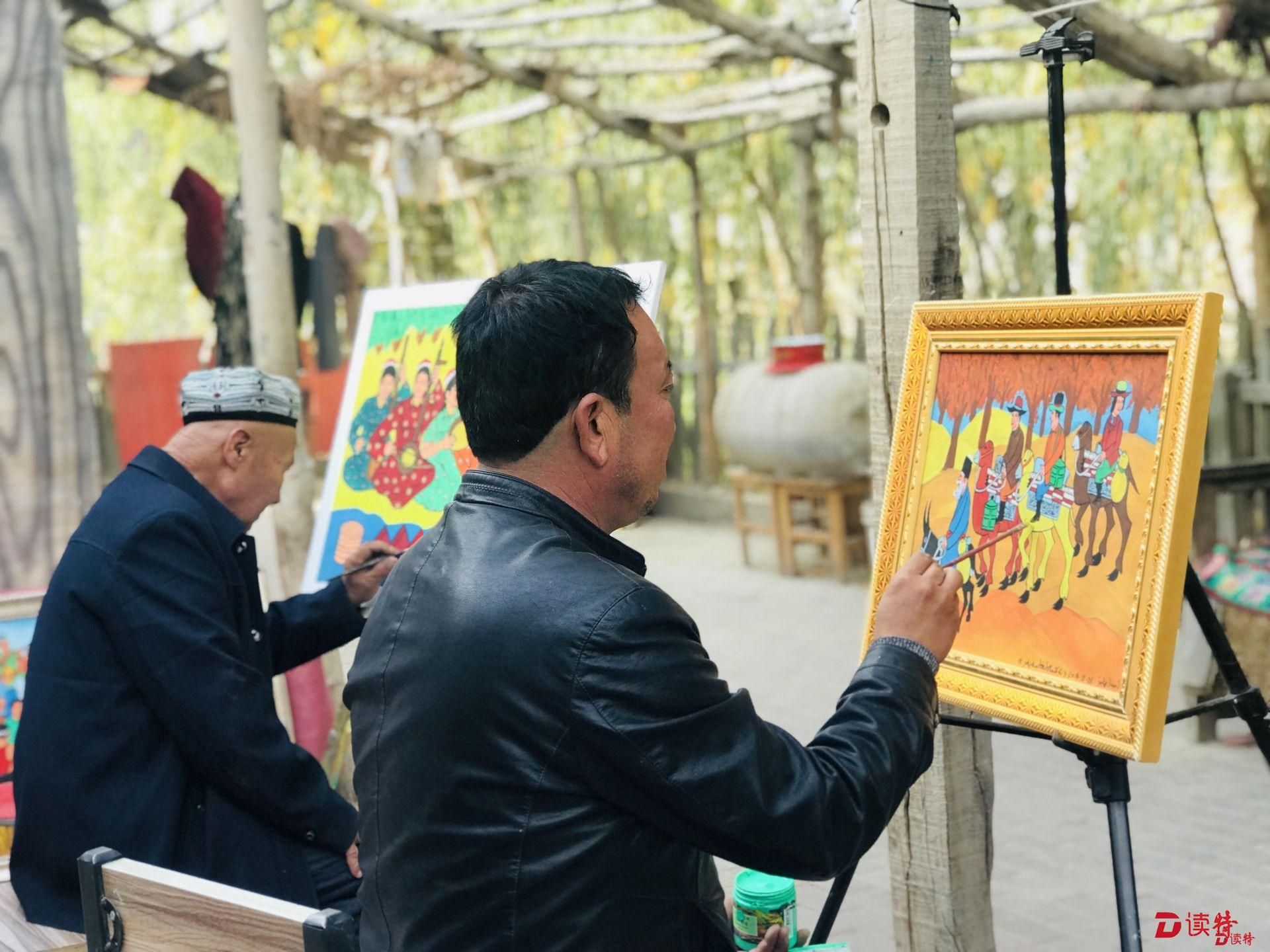 國(guó)家級(jí)農(nóng)民畫(huà)畫(huà)家木卡熱埔江·艾海提告訴記者記者,他現(xiàn)在一年有將近45000元的收入,一部分來(lái)自于在安居房上畫(huà)農(nóng)民畫(huà),一年有30000塊錢(qián)的收入,另一部分是自己賣(mài)出的畫(huà),一年能掙15000?!艾F(xiàn)在麥蓋提旅游的人多了,看到他們喜歡我的畫(huà),我感到很高興,現(xiàn)在越畫(huà)越有勁了!”聊起麥蓋提的發(fā)展,木卡熱埔江的臉上難掩喜悅。