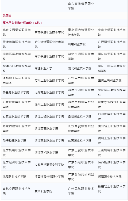 入圍“雙高計(jì)劃”的高職院校分為四類,其中第一類包括高水平學(xué)校建設(shè)單位(A檔)10所;第二類包括高水平學(xué)校建設(shè)單位(B檔)20所;第三類包括高水平學(xué)校建設(shè)單位(C檔)26所、高水平專業(yè)群建設(shè)單位(A檔)26所、高水平專業(yè)群建設(shè)單位(B檔)59所;第四類包括高水平專業(yè)群建設(shè)單位(C檔)56所。