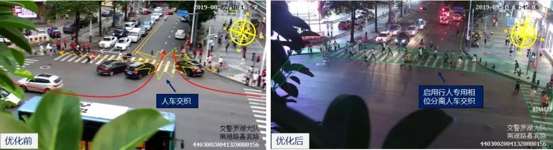 針對現(xiàn)狀問題,深圳交警采用單周雙次的信控策略,小批量、多頻次地放行嘉賓路方向車輛,緩解因公交車隊列化導致路口交通鎖死的問題;同時,采用行人專用相位集中放行行人,保障行人過街安全。路口優(yōu)化后,路口“回堵”現(xiàn)象顯著減少,行人過街安全性提高,路口高峰小時通過量從2130pcu/h增至2285pcu/h,上升7.28%。