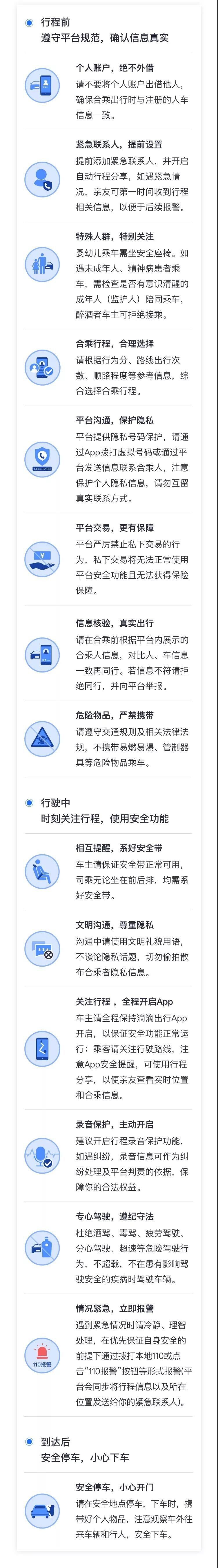 新方案顯示,試運(yùn)營(yíng)期間,將在以上7個(gè)城市首先提供5:00~23:00(女性5:00~20:00)、市內(nèi)中短途(50公里以內(nèi))的順風(fēng)車平臺(tái)服務(wù)。試運(yùn)營(yíng)期間,不收取信息服務(wù)費(fèi)。