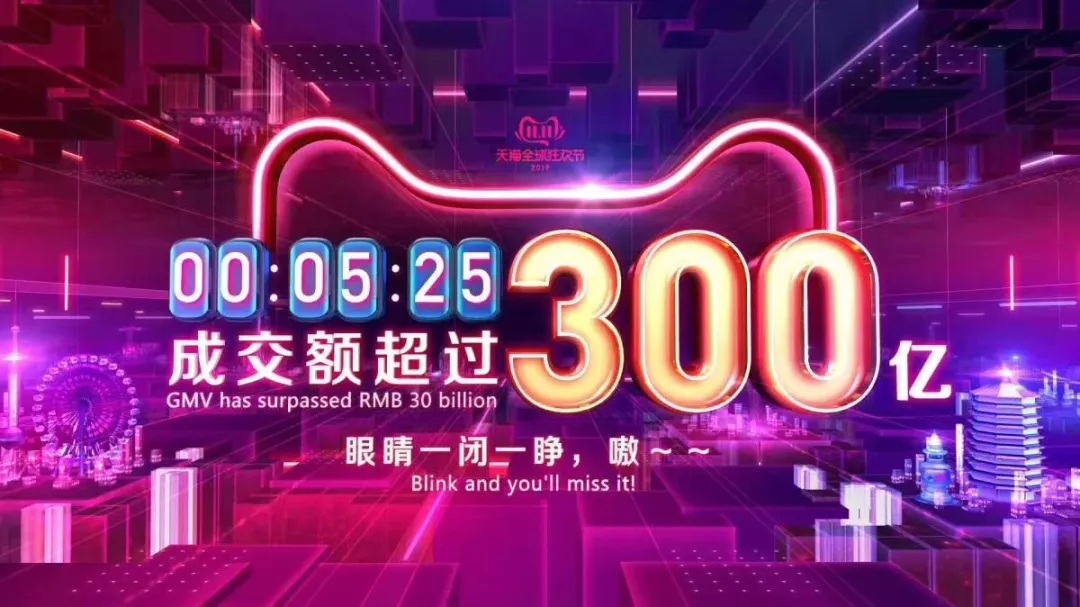 5分25秒,天貓雙十一銷售額突破300億元