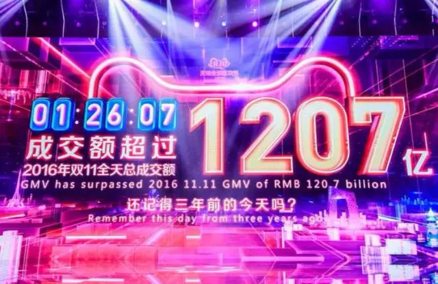 南方日?qǐng)?bào)2019年11月11日訊 11月11日剛過(guò)1小時(shí)26分07秒,天貓雙11實(shí)時(shí)成交額達(dá)1207億元,超越2016年全天。去年,天貓雙11成交額抵達(dá)1207億用時(shí)8小時(shí)8分52秒,這也意味著,今年成交破1207億速度比去年快了近7小時(shí)。