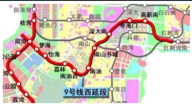 地鐵9號(hào)線西延線(二期)線路東起紅樹(shù)灣南站,經(jīng)深圳灣至前海灣,全長(zhǎng)約10.8公里,站點(diǎn)為前灣、夢(mèng)海、怡海、荔林、南油西、南油、南山書城、深大南、粵海門、高新南、紅樹(shù)灣南。其中,換乘站為5座,在前灣站換乘5號(hào)線、南油站換乘12號(hào)線、深大南站換乘15號(hào)線、粵海門站換乘13號(hào)線、紅樹(shù)灣站換乘11號(hào)線。