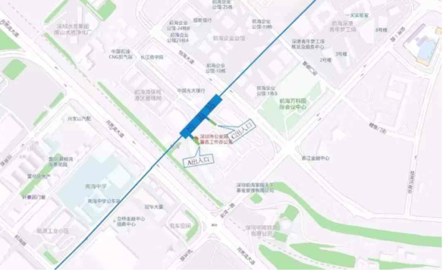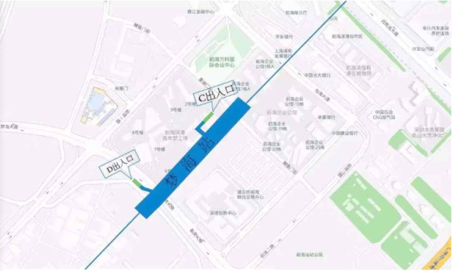 怡海站位于怡海大道與月亮灣大道中間,車(chē)站出入口共計(jì)4個(gè),B、D出入口預(yù)留,A出入口接光大銀行,連接怡海大道,C出入口前海展廳旁,連接A號(hào)公路