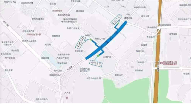 南油西站位于東濱路與南光路交叉口上,車(chē)站出入口共計(jì)3個(gè),A出入口位于匯賓廣場(chǎng)東側(cè),C出入口位于永新時(shí)代廣場(chǎng)的西側(cè),D出入口位于南光路與東濱路交匯處北側(cè)
