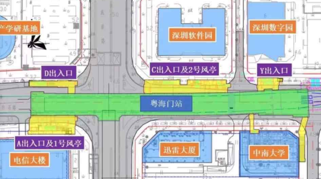 粵海門(mén)站位于白石路與科苑南路交叉口處,車(chē)站出入口共計(jì)4個(gè),其中A出入口位于電信大樓旁,D出入口位于深港產(chǎn)學(xué)研基地旁,C、Y出入口位于白石路北側(cè),靠近深圳軟件園及數(shù)字園。