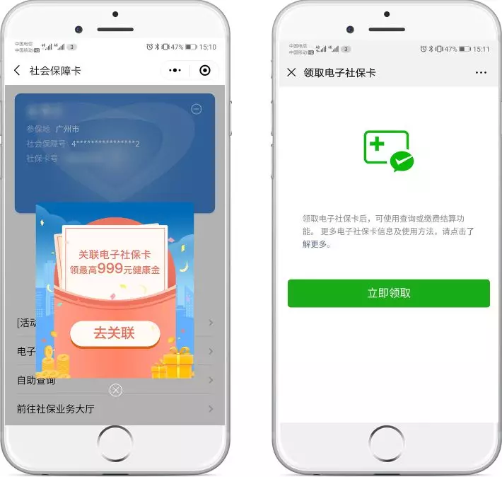 關(guān)聯(lián)完成后,點擊彈窗領(lǐng)取電子社??ǎ陔娮由绫?I(lǐng)取頁面點擊“立即領(lǐng)取”。