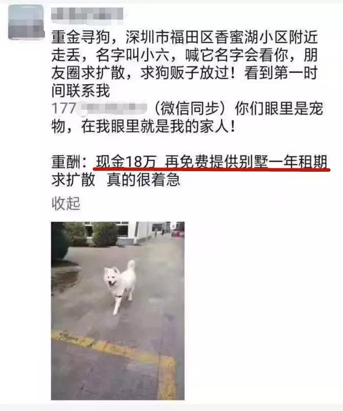 近日,深圳有位狗主人在朋友圈尋狗,重酬的內容是:現金18萬+一年別墅使用權
