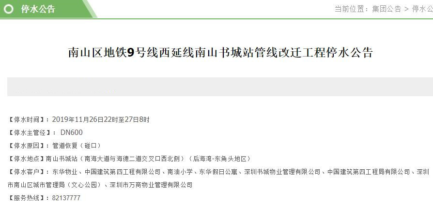 停水客戶:東華物業(yè)、中國建筑第四工程有限公司、南油小學(xué)、東華假日公寓、深圳書城物業(yè)管理有限公司、中國建筑第四工程局有限公司、深圳市南山區(qū)城市管理局(文心公園)、深圳市萬商物業(yè)管理有限公司