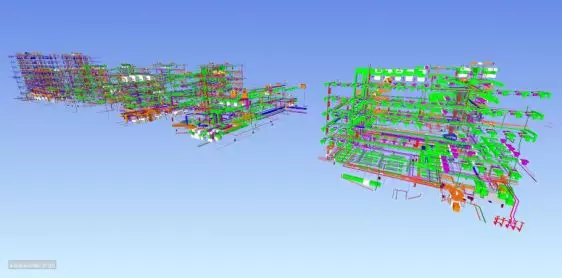 在施工準(zhǔn)備階段,優(yōu)化原設(shè)計(jì)圖紙,提前解決施工階段遇到的問(wèn)題,實(shí)現(xiàn)BIM深化圖指導(dǎo)現(xiàn)場(chǎng)施工放樣及管道安裝,滿(mǎn)足規(guī)范及空間使用要求;施工實(shí)施階段,基于BIM深化模型輸出工程量清單,輔助材料管理人員物資采購(gòu)管理,支架深化及輸出加工圖,推進(jìn)項(xiàng)目精細(xì)化管理。