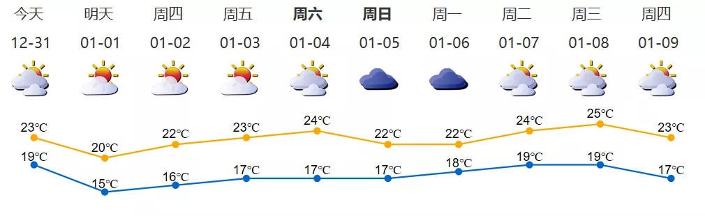 12月31日-1月1日,受冷空氣影響,氣溫下降,1日早晨最低氣溫15℃左右,沿海、高地和海區(qū)最大陣風(fēng)7級左右,2日多云間晴天,氣溫回升。