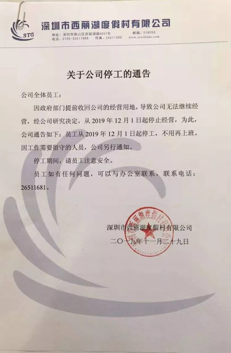 2019年11月29日,西麗湖度假村發(fā)布通告稱,政府提前收回經(jīng)營用地,從2019年12月1日停止營業(yè),已經(jīng)不接待外來游客,員工同時停工——這意味著市民所熟知的西麗湖度假村即將走下舞臺。
