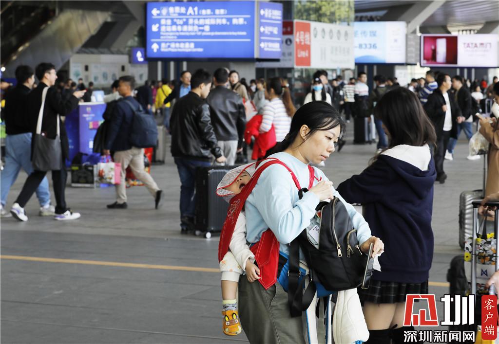 深圳北站東廣場入站口,一位家長背著一位熟睡的孩子。