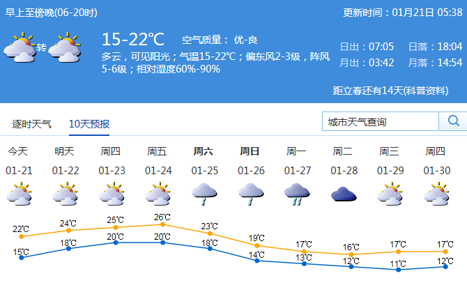 見圳客戶端·深圳新聞網(wǎng)2020年1月21日訊 據(jù)深圳市氣象臺(tái)消息,今日深圳多云,可見陽(yáng)光;氣溫15-22℃;偏東風(fēng)2-3級(jí),陣風(fēng)5-6級(jí);相對(duì)濕度60%-90%。預(yù)計(jì)早晨天氣偏涼,出門注意保暖,預(yù)防感冒。