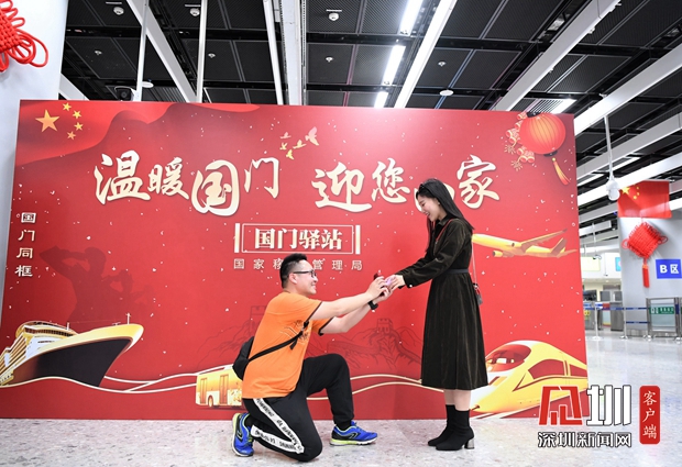 1月20日,西九龍邊檢站“國(guó)門驛站”展板前,在邊檢民警的掌聲和祝福中,旅客官先生鄭重向女友宋女士求婚,有情人終成眷屬,“在國(guó)門求婚,把愛(ài)人帶回家門”成為一段佳話。為營(yíng)造溫馨喜慶的春節(jié)氛圍,該站在口岸設(shè)置主題活動(dòng)展板,懸掛節(jié)日裝飾,還研發(fā)小程序,在驗(yàn)證臺(tái)一體機(jī)向旅客展示主題海報(bào),令人耳目一新。