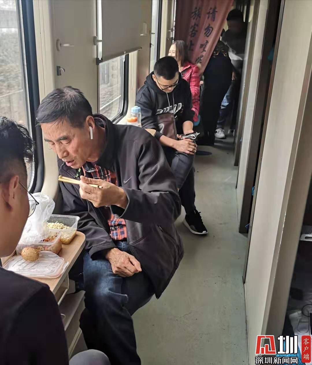 午飯期間,正在吃泡面的老人家是和我一起到終點(diǎn)站的東北人,他和妻子年輕時(shí)就來深圳打拼,每一年無論春運(yùn)的車票多么難搶,他和伴都必須回家過年,他說回到東北,聽著大家說的方言,熱熱鬧鬧的,才覺得這個(gè)年過得有意義。