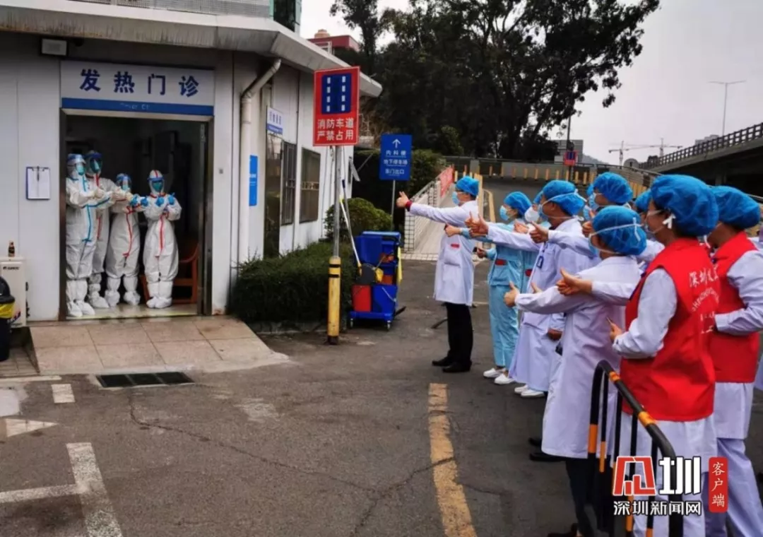 大年初一早上九點(diǎn),深圳市第二人民醫(yī)院發(fā)熱門診門口,院長(zhǎng)正在帶隊(duì)慰問(wèn)在發(fā)熱門診一線“戰(zhàn)疫”的工作人員,因?yàn)樘幱诿舾胁^(qū),發(fā)熱門診的工作人員只能這樣全幅武裝地表達(dá)決心。
