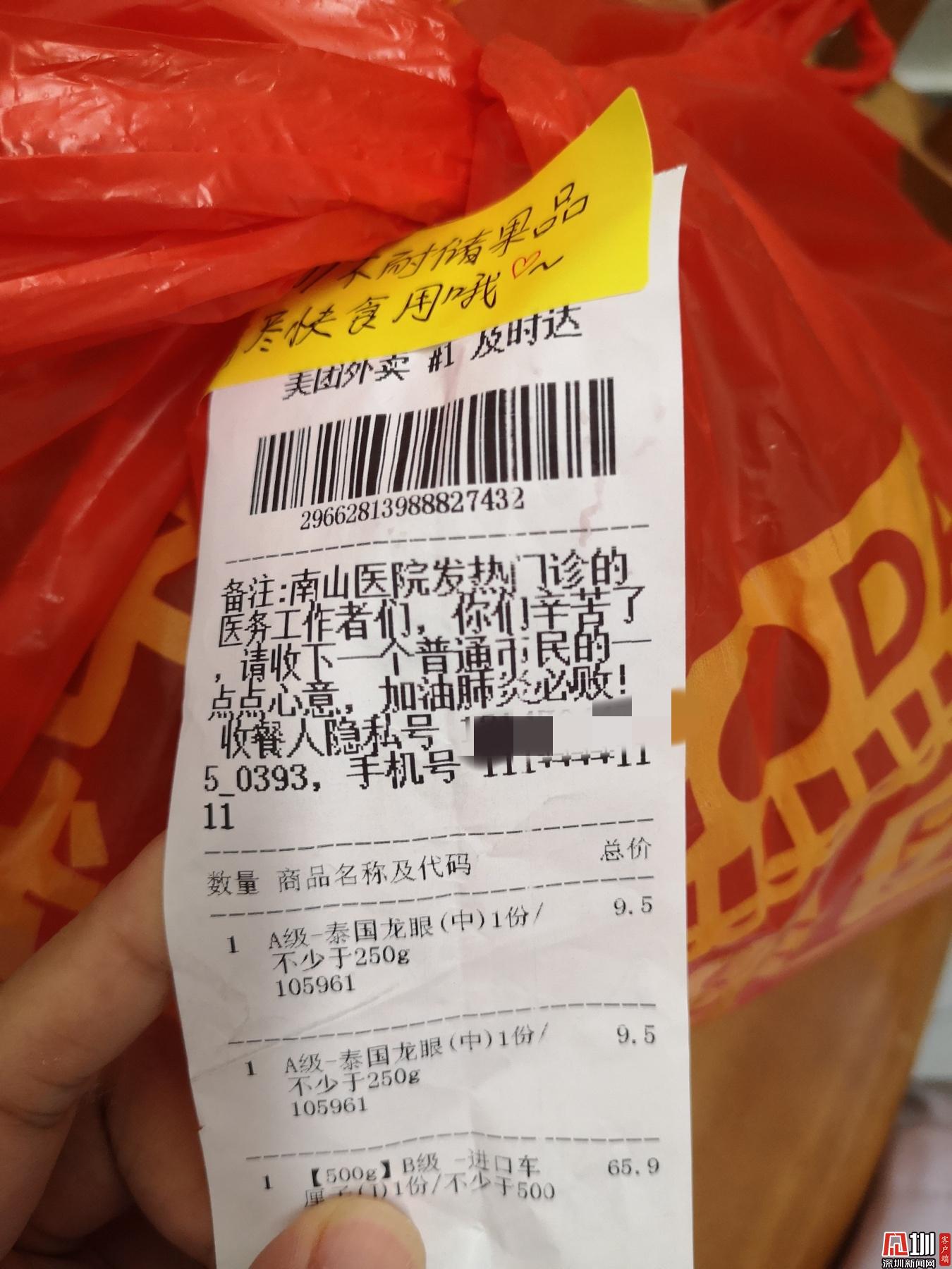 見圳客戶端·深圳新聞網(wǎng)2020年2月1日訊 (見圳客戶端、深圳新聞網(wǎng)記者 劉夢(mèng)婷 通訊員 深協(xié)和)“老淚縱橫!”1月30日晚上8點(diǎn)56分,華中科技大學(xué)協(xié)和深圳醫(yī)院(南山醫(yī)院)手外科護(hù)士王敏在朋友圈曬了一張照片,瞬時(shí)網(wǎng)友們紛紛點(diǎn)贊。照片里是一個(gè)紅色塑料袋上貼著一張外賣單,備注上寫著,“南山醫(yī)院發(fā)熱門診的醫(yī)務(wù)工作者們,你們辛苦了!請(qǐng)收下一個(gè)普通市民的一點(diǎn)點(diǎn)心意,加油,肺炎必?cái)?!?/p>
