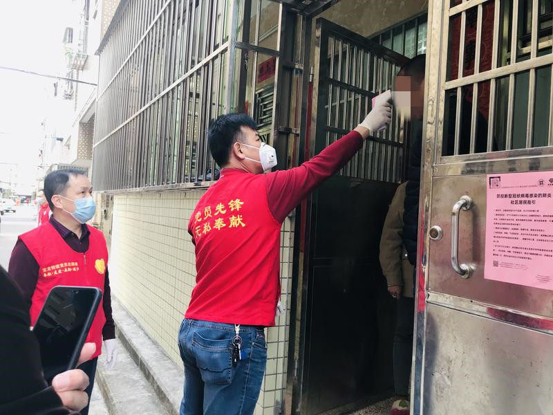 社區(qū)黨委書記黃雄光同志及班子成員、工作人員為居家隔離人員測量體溫。