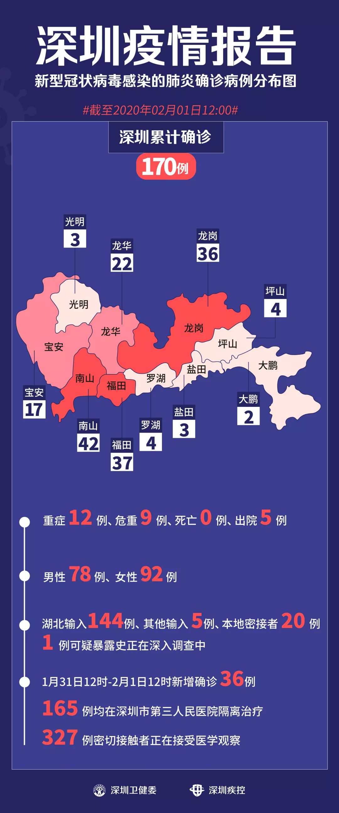 深圳病人糞便中檢出病毒陽性 2月1日晚,深圳市第三人民醫(yī)院透露,該院肝病研究所發(fā)現(xiàn),在某些新型冠狀病毒感染的肺炎確診患者的糞便中檢測出2019-nCoV核酸(新型冠狀病毒)陽性,很有可能提示糞便中有活病毒存在。目前研究人員正在做進一步分離病毒的研究。 此外,國際醫(yī)學期刊《新英格蘭醫(yī)學雜志》最新刊登的一篇文章也透露,醫(yī)生們在美國首位“新型肺炎”病人的腹瀉糞便樣本中檢測出了新型冠狀病毒的存在(rRT-PCR結(jié)果陽性)。 在此提醒市民,一定要更加注意勤洗手,尤其是便后、飯前,一定要用流水+肥皂或洗手液,洗手20秒以上。 1月31日12時至2月1日12時,深圳新增36個確診病例 病例135 47歲女性患者,常住北京。1月15日前往武漢探親,22日乘私家車前往深圳。1月23日發(fā)病,1月27日入院,目前情況穩(wěn)定。 病例136 病例98的女兒 4歲女性患者,常住湖北省十堰市。在密切接觸者采樣檢測中,發(fā)現(xiàn)新型冠狀病毒陽性,故于1月27日入院,目前情況穩(wěn)定。 病例97:64歲男性患者,常住于湖北省十堰市。2020年1月22日抵達深圳,24日發(fā)病,26日入院就診。 病例98(病例97的兒子):40歲男性患者,常住于深圳市龍崗區(qū)。2020年1月22日,父親從湖北抵達深圳,24日發(fā)病,26日入院就診。 病例137 56歲男性患者,常住湖北省武漢市。1月21號前往深圳。1月26日發(fā)病,1月28日入院,目前情況穩(wěn)定。 病例138 59歲男性患者,常住深圳市龍華區(qū)。1月16日自駕從深圳前往武漢,1月23日開車回到深圳。1月26日發(fā)病,當日入院,目前情況穩(wěn)定。 病例139 病例138妻子 57歲女性患者,常住深圳市龍華區(qū)。1月16日自駕深圳前往武漢,1月23日開車回到深圳。1月24日發(fā)病,1月26日入院,目前情況穩(wěn)定。 病例140 66歲女性患者,常住湖北省武漢市。1月22日前往深圳。1月23日發(fā)病,1月28日入院,目前情況穩(wěn)定。 病例141 78歲男性患者,常住湖北省武漢市。1月16日前往深圳探親。1月26日發(fā)病,1月27日入院,目前情況穩(wěn)定。 病例142 61歲女性患者,常住湖北省武漢市。1月21日前往深圳探親。1月22日發(fā)病,1月28日入院,目前情況穩(wěn)定。 病例143 54歲男性患者,常住深圳市南山區(qū)。1月21日前往武漢,23日返回深圳。1月25日發(fā)病,1月28日入院,目前情況穩(wěn)定。 病例144 55歲女性患者,常住深圳市南山區(qū)。1月21日由深圳前往武漢,23日返回深圳。1月24日發(fā)病,1月29日入院,目前情況穩(wěn)定。 病例145 57歲女性患者,常住深圳市南山區(qū)。1月13日從深圳到武漢探親,1月23日從武漢自駕返回深圳。1月26日發(fā)病,1月27日入院,目前情況穩(wěn)定。 病例146 病例29父親 76歲男性患者,常住湖北省武漢市。1月15日從武漢出發(fā)前往廣西南寧旅游,1月18日從廣西南寧出發(fā)前往深圳探親。1月27日發(fā)病,1月28日入院,目前情況穩(wěn)定。 病例29:49歲女性患者,長期居住湖北武漢,2020年1月15日從武漢到廣西南寧,18日從南寧到佛山,20日從佛山抵達深圳,21日發(fā)病,22日入院就診。 病例147 病例105的女兒 6歲女性患者,常住深圳市羅湖區(qū)。1月12日前往武漢,1月22日乘私家車前往河南信陽,23日乘私家車前往深圳。在密切接觸者采樣檢測中發(fā)現(xiàn),新型冠狀病毒陽性,故于1月28日入院,目前情況穩(wěn)定。 病例105:35歲男性患者,常住于深圳市羅湖區(qū)。2020年1月17日自駕車由深圳開往武漢,22日自駕車從武漢開往河南信陽探親,23日自駕車從河南信陽開往深圳,當日發(fā)病,25日入院就診。 病例106(病例105妻子):36歲女性患者,常住于深圳市羅湖區(qū)。2020年1月17日乘私家車由深圳到武漢,22日乘私家車從武漢到河南信陽探親,23日乘私家車從河南信陽到深圳,24日發(fā)病,25日入院就診。 病例107(病例105丈母娘):61歲女性患者,常住于深圳市羅湖區(qū)。1月12日從深圳前往武漢,22日乘私家車從武漢到河南信陽探親,23日乘私家車從河南信陽到深圳,24日發(fā)病,25日入院就診。 病例148 38歲女性患者,常住深圳市福田區(qū)。1月23日接觸從武漢來深的父母(都未確診)。1月27日發(fā)病,當日入院,目前情況穩(wěn)定。 病例149 33歲女性患者,常住深圳市福田區(qū)。1月19日前往武漢,乘私家車到潛江探親,1月24日乘私家車返回深圳。1月28日發(fā)病,當日入院,目前情況穩(wěn)定。 病例150 49歲男性患者,常住深圳市龍華區(qū)。1月18日前往武漢探親,1月23日回到深圳。1月25日發(fā)病,1月27日入院,目前情況穩(wěn)定。 病例151 病例150的女兒 18歲女性患者,常住深圳市龍華區(qū)。1月18日前往武漢探親,1月23日回到深圳。1月25日發(fā)病,1月29日入院,目前情況穩(wěn)定。 病例152 56歲女性患者,常住江蘇省南京市。1月21日乘私家車到武漢,1月22日前往深圳。1月26日發(fā)病,當日入院,目前情況穩(wěn)定。 病例153 病例84的丈夫 58歲男性患者,常住深圳市龍華區(qū)。在密切接觸者采樣檢測中發(fā)現(xiàn),新型冠狀病毒陽性,故于1月29日入院,目前情況穩(wěn)定。 病例84:52歲女性患者,常住深圳市龍華區(qū)。2020年1月19日至22日在武漢,22日-23日從武漢到仙桃市探親,23日發(fā)病,24日駕車至長沙,25日從長沙抵達深圳后入院就診。 病例154 病例114的妻子 34歲女性患者,常住深圳市龍華區(qū)。1月22日前往湖南省冷水江市,1月27日返回深圳。1月26日發(fā)病,1月28日入院,目前情況穩(wěn)定。 病