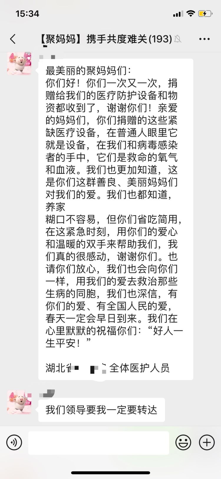 “最美麗的聚媽媽們,你們捐贈(zèng)的這些緊缺醫(yī)療設(shè)備,在普通人眼里它就是設(shè)備,在我們和病毒感染者的手中,它們是救命的氧氣和血液”,武漢一家醫(yī)院的醫(yī)護(hù)人員在近日發(fā)來(lái)的感謝信中說(shuō),“請(qǐng)你們放心,我們也會(huì)向你們一樣,用我們的愛(ài)去救治那些生病的同胞,我們也深信,有你們的愛(ài)、有全國(guó)人民的愛(ài),春天一定會(huì)早日到來(lái)?!保ㄓ浾哧愭?