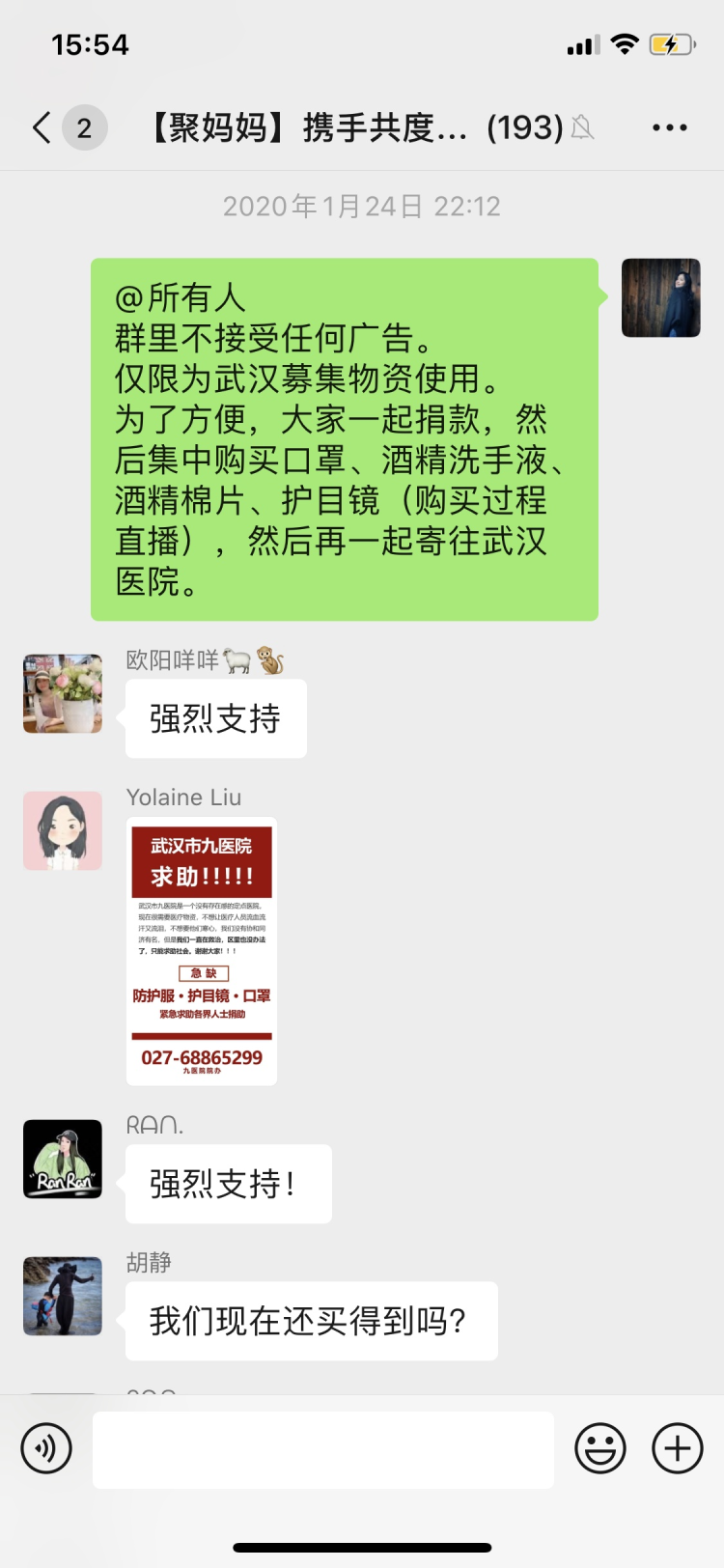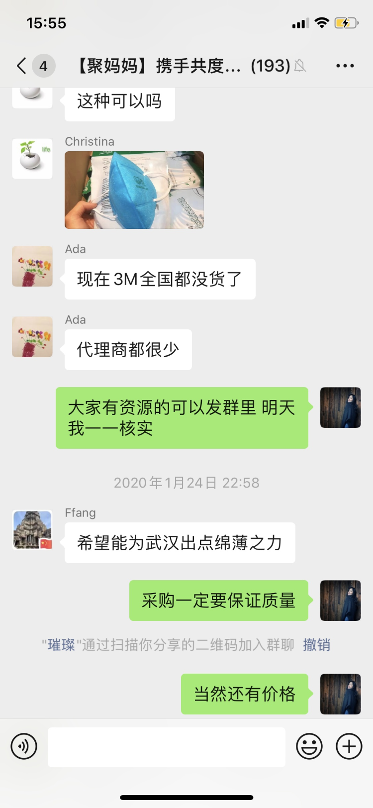 這一百多名媽媽是一個(gè)名為“聚媽媽攜手共渡難關(guān)”(以下簡(jiǎn)稱(chēng)“聚媽媽”)微信群的成員,Miya是“聚媽媽”的發(fā)起人之一。1月24日除夕那天,Miya與一位朋友聊起疫情,兩人都覺(jué)得,醫(yī)院缺物資,一兩人的力量又太單薄,不如發(fā)動(dòng)朋友們一起購(gòu)買(mǎi)直接送到醫(yī)院。Miya在當(dāng)晚9點(diǎn)左右建了這個(gè)臨時(shí)群,并邀請(qǐng)周?chē)熳R(shí)的朋友加入。