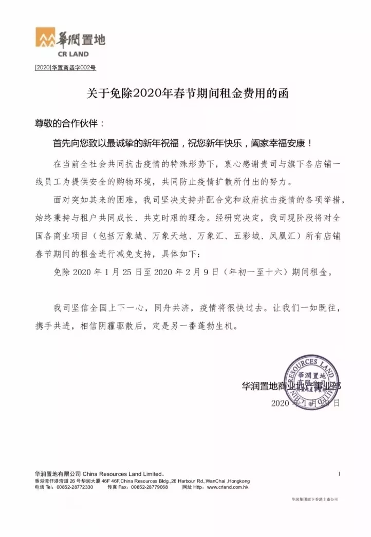 華潤置地宣布免收1月25日—2月9日全國所有商業(yè)項目的租金,與商戶攜手共進。