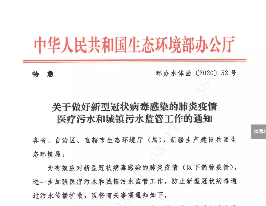 而在2月1號深夜,生態(tài)環(huán)境部印發(fā)通知,部署醫(yī)療污水和城鎮(zhèn)污水監(jiān)管工作,規(guī)范醫(yī)療污水應(yīng)急處理、殺菌消毒要求,防止新型冠狀病毒通過糞便和污水?dāng)U散傳播。