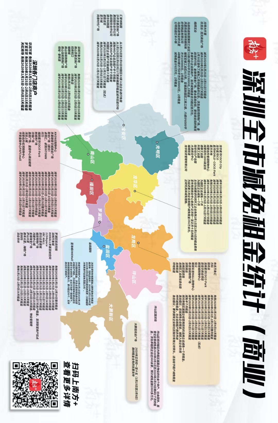 這次做了一個(gè)深圳抗疫惠企減免租金地圖,對(duì)各種政策做了盤點(diǎn),涉及多個(gè)企業(yè)及十區(qū),讀者可以一一查閱。