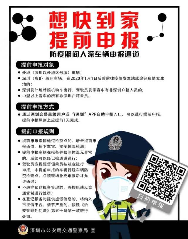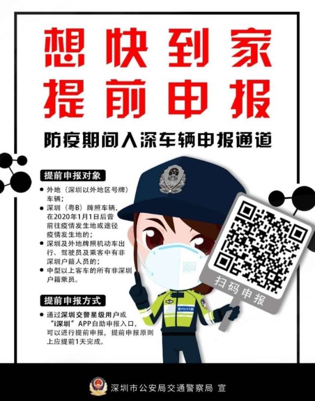 深圳交警提示,預(yù)計(jì)返深車流將逐漸增大,為了更快速的通過(guò)檢疫點(diǎn),建議即將返深的車主和廣大市民提前通過(guò)網(wǎng)上進(jìn)行申報(bào)。