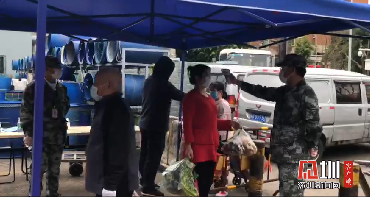 福田農(nóng)批市場(chǎng)出入口處配備專人進(jìn)行體溫測(cè)試。