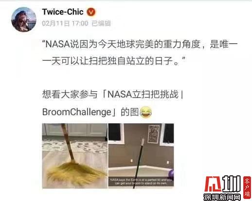 見(jiàn)圳客戶端·深圳新聞網(wǎng)2020年2月11日訊 (見(jiàn)圳客戶端、深圳新聞網(wǎng)記者 吳英敏)2月11日,有網(wǎng)友在微博曬出兩張掃把直立的照片:“宅在家里試了一下NASA立掃把挑戰(zhàn),據(jù)說(shuō)一年中只有今天可以立起來(lái),親測(cè)有效!”記者也在朋友圈發(fā)現(xiàn)許多朋友紛紛曬出掃把直立成功的圖片,有網(wǎng)友稱(chēng),“宅家立掃把”將全國(guó)人民心相連了!隨后,人民日?qǐng)?bào)微博辟謠稱(chēng),真相是,掃帚能立起來(lái)與今天的引力無(wú)關(guān),每天都可以立,只要你能找到平衡!