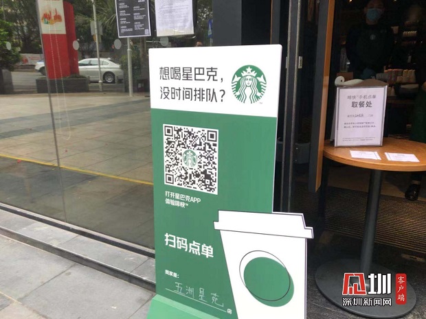 星巴克門(mén)前設(shè)置“掃碼點(diǎn)單”。