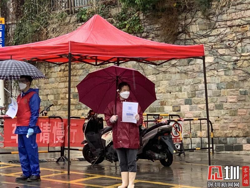 來(lái)自龍崗區(qū)南嶺村的鄧育芳,是不少租戶的房東,也是值守在南嶺南路黨員先鋒崗的一名村民志愿者。連續(xù)十多天,她每天在村口站立整整7個(gè)小時(shí),不停為出入居民測(cè)量體溫、詢問(wèn)來(lái)源地、查驗(yàn)申報(bào)二維碼、引導(dǎo)注冊(cè)。