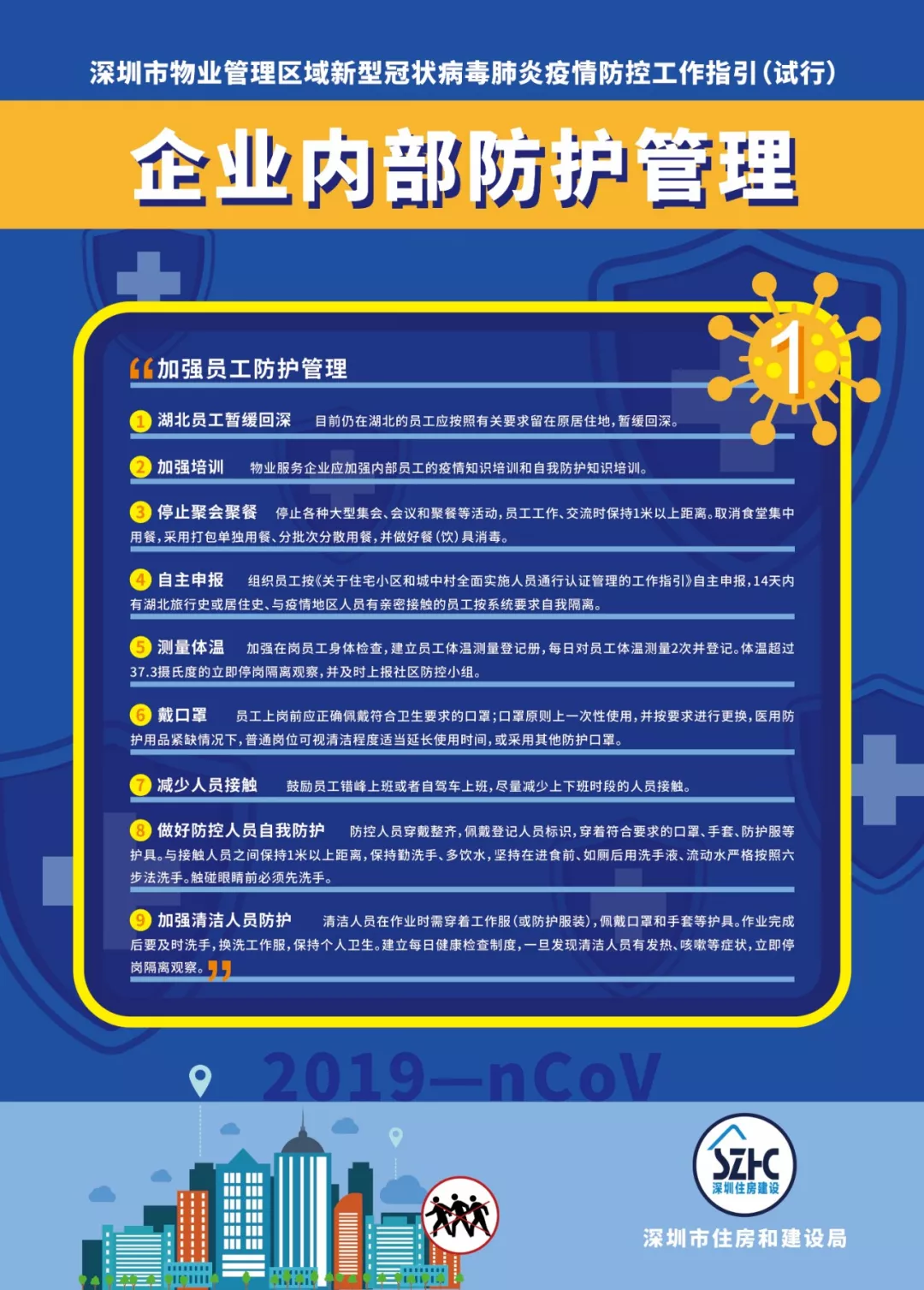 為進一步做好物業(yè)管理區(qū)域新型冠狀病毒肺炎疫情防控工作,依據(jù)《廣東省物業(yè)管理區(qū)域新型冠狀病毒感染的肺炎疫情防控工作指引(試行)》《深圳市新型冠狀病毒感染的肺炎疫情防控指揮部印發(fā)關(guān)于建立健全社區(qū)聯(lián)防聯(lián)控機制的若干措施的通知》《深圳市新型冠狀病毒感染的肺炎疫情防控指揮部辦公室社區(qū)小區(qū)組工作方案》《深圳市新型冠狀病毒感染的肺炎疫情防控指揮部辦公室關(guān)于印發(fā)住宅小區(qū)和城中村全面實施人員通行認證管理的工作指引的通知》等文件,結(jié)合當前實際,市住房建設局編制了《深圳市物業(yè)管理區(qū)域新型冠狀病毒肺炎疫情防控工作指引(試行)》,現(xiàn)印發(fā)給你們,請參照執(zhí)行。